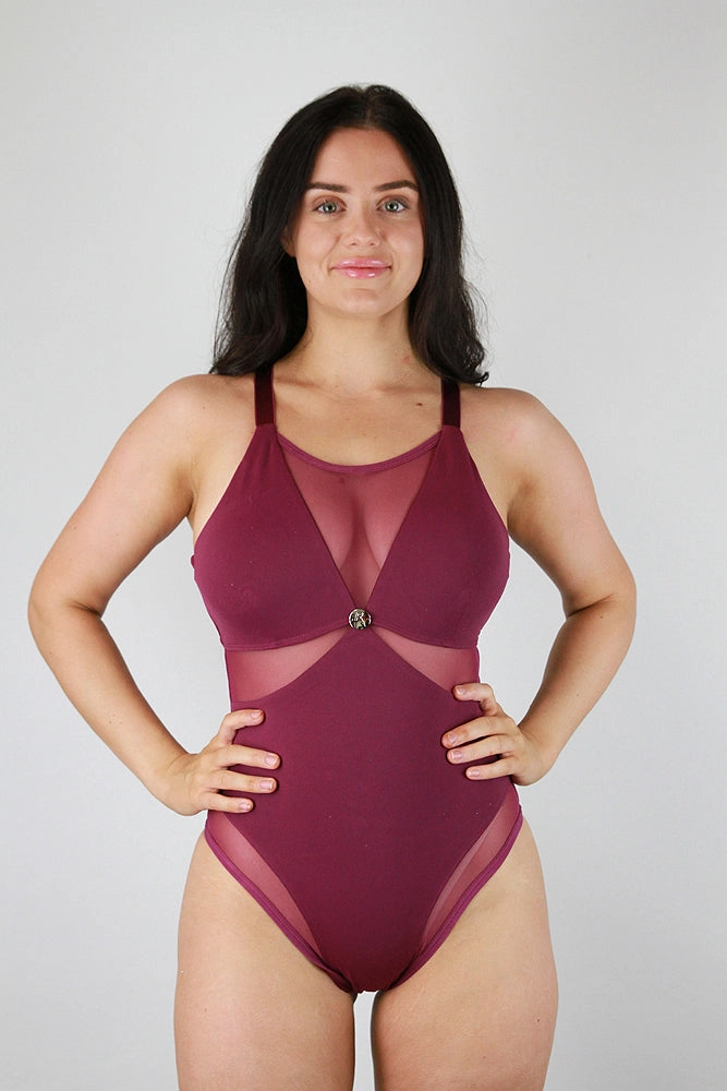 * Features flattering high scoop neckline with mesh panel * Shiny elastic straps giving you a supportive fit and allow movement for all different body types * Removable Bra padding * Features criss cross detail on back and Scrunchie bum * Made from a super soft spandex with mesh panels * Rarr circle metal medallion * Perfect for performances * This stunning leotard can be worn as a bodysuit Fabric & Care