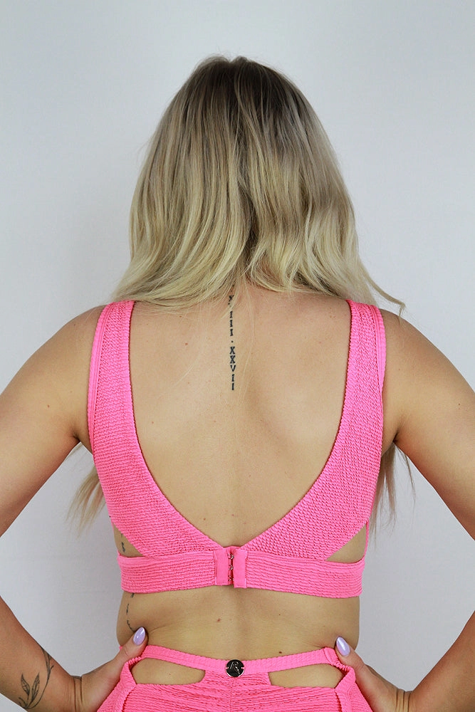 * Thick straps giving you a supportive fit and allow movement for all different body types * Flattering U neckline, U scoop back neckline * Side boob cut outs * Adjustable back bra clasp opening * Elastic hem * Feature crinkle fabric * Can be worn as a bralette * Rarr metal medallion * Removable Bra padding and fully lined